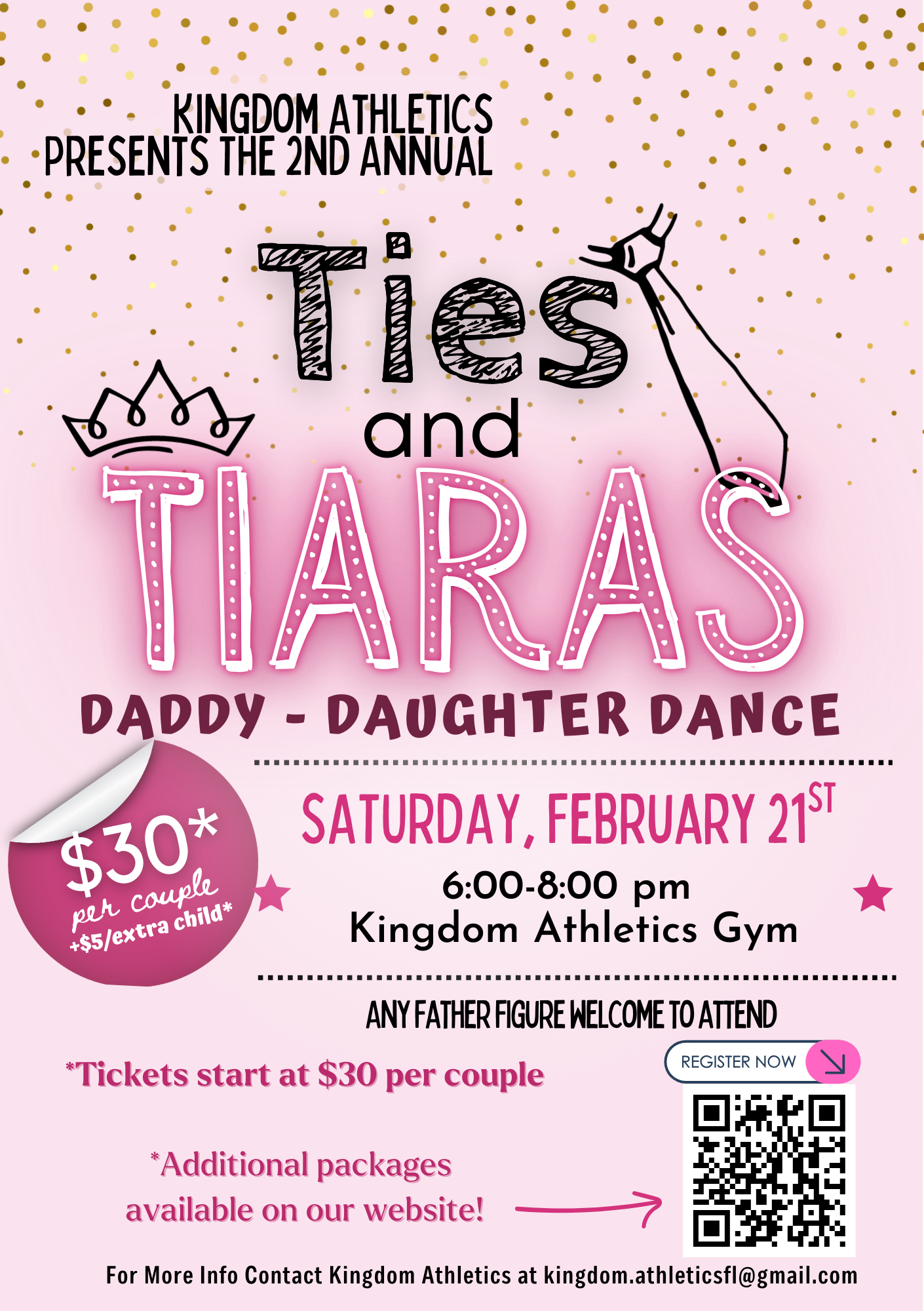 Get ready for an enchanting evening at Kingdom Athletics! We are thrilled to host our 2nd Annual Ties and Tiaras Daddy-Daughter Dance on Saturday, February 21st, from 6:00 PM to 8:00 PM. This special event is designed to create lasting memories in a high-energy, inclusive environment, and we welcome any father figure to attend with...